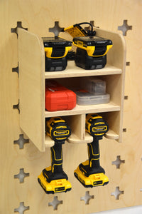 • Praktisch: Der Halter ist für 2 Bohrmaschinen vorbereitet und verfügt über praktische Fächer für Bohrer und Ladestationen.