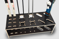 • Geräumig: Der Holzständer ist für 4 Paar Alpinski, 4 Paar Langlaufski und 8 Paar Skistöcke ausgelegt. Die Öffnungen für Alpinski haben Maße von 13 x 2,7 cm – auf Wunsch sind größere Öffnungen möglich. Jede Öffnung für Langlaufski ist einzeln ausgelegt. Die gängigsten Langlaufski haben an der Ferse eine Breite von 40–48 mm, sodass sie problemlos in die 55 x 16 mm großen Öffnungen passen. Die Öffnungen für die Skistöcke sind so gestaltet, dass die Stöcke aufrecht stehen.